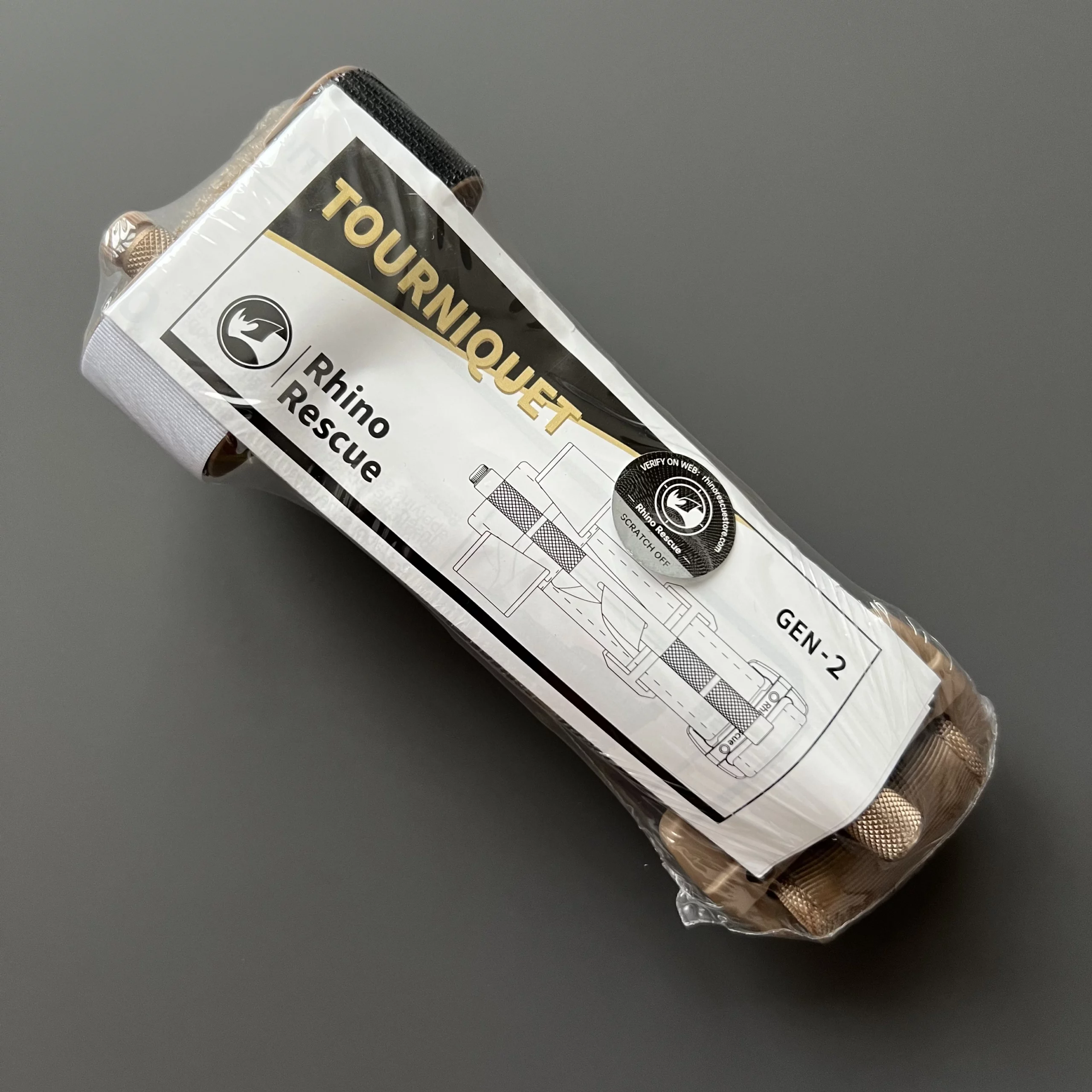 Turniket Rhino Rescue má obal velmi podobný, akorát je velmi těžké ho roztrhnout jednou rukou (natož v kožené rukavici). I tak je ale turniket od Rhino Rescue složený přímo na okamžité použití jednou rukou (stejně jako CAT).