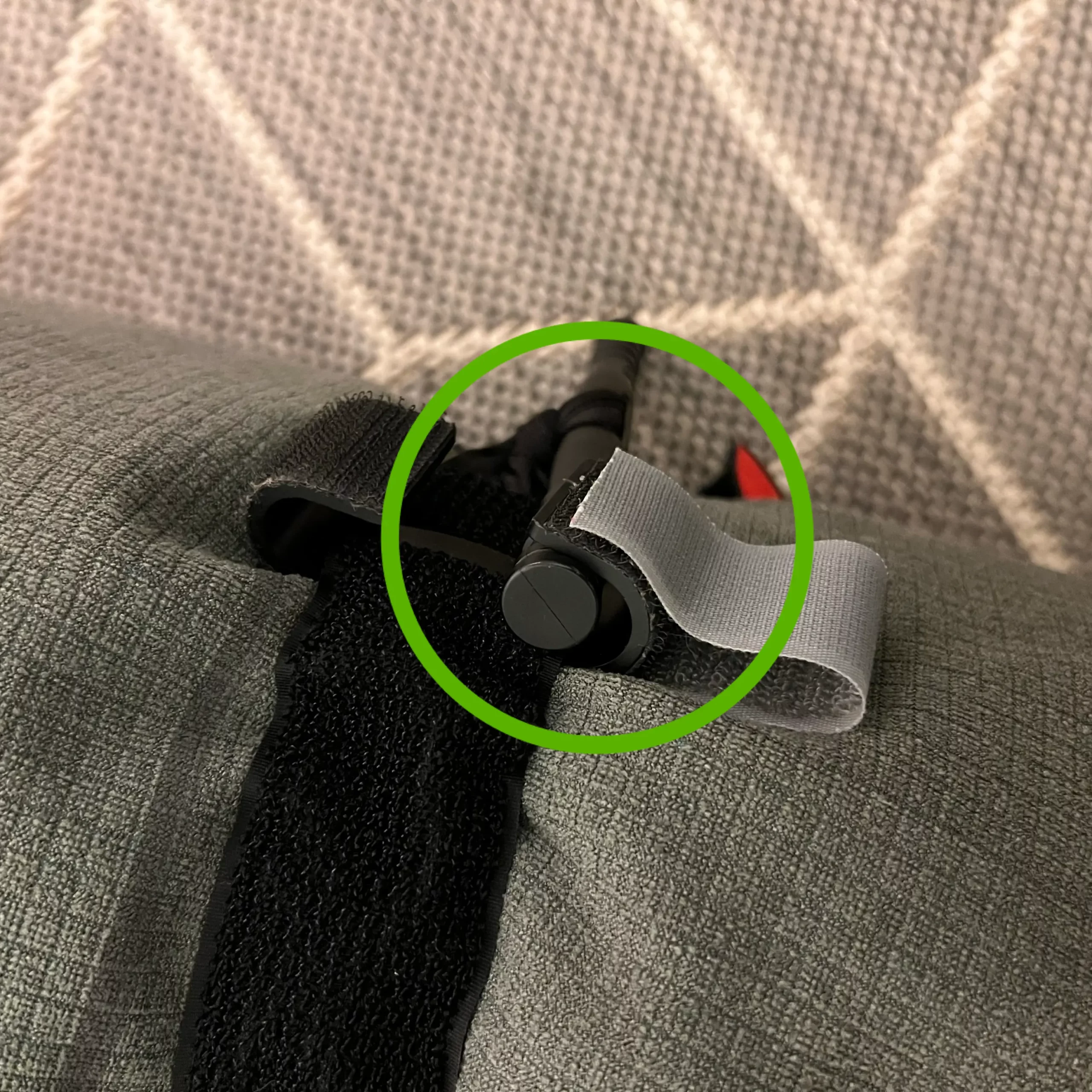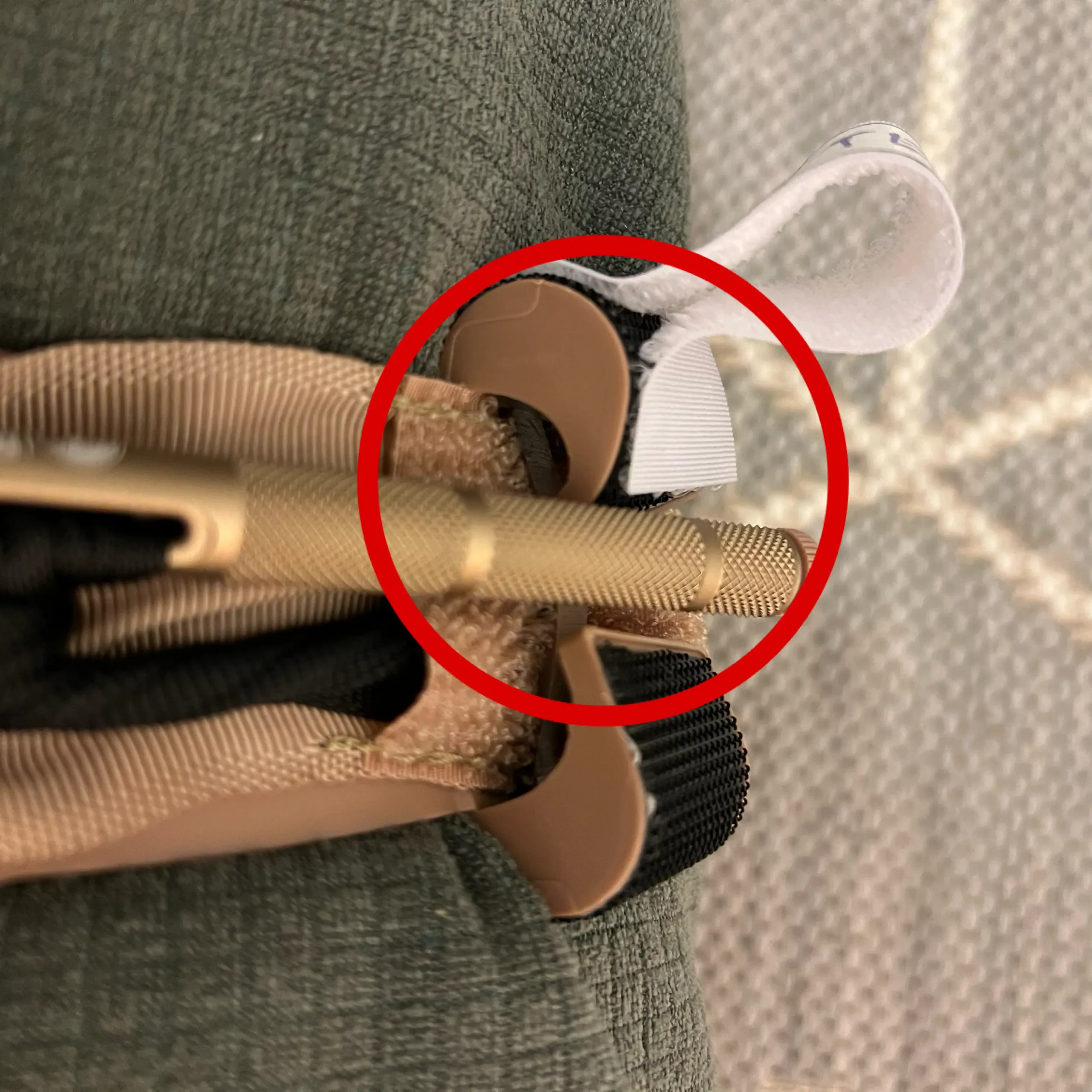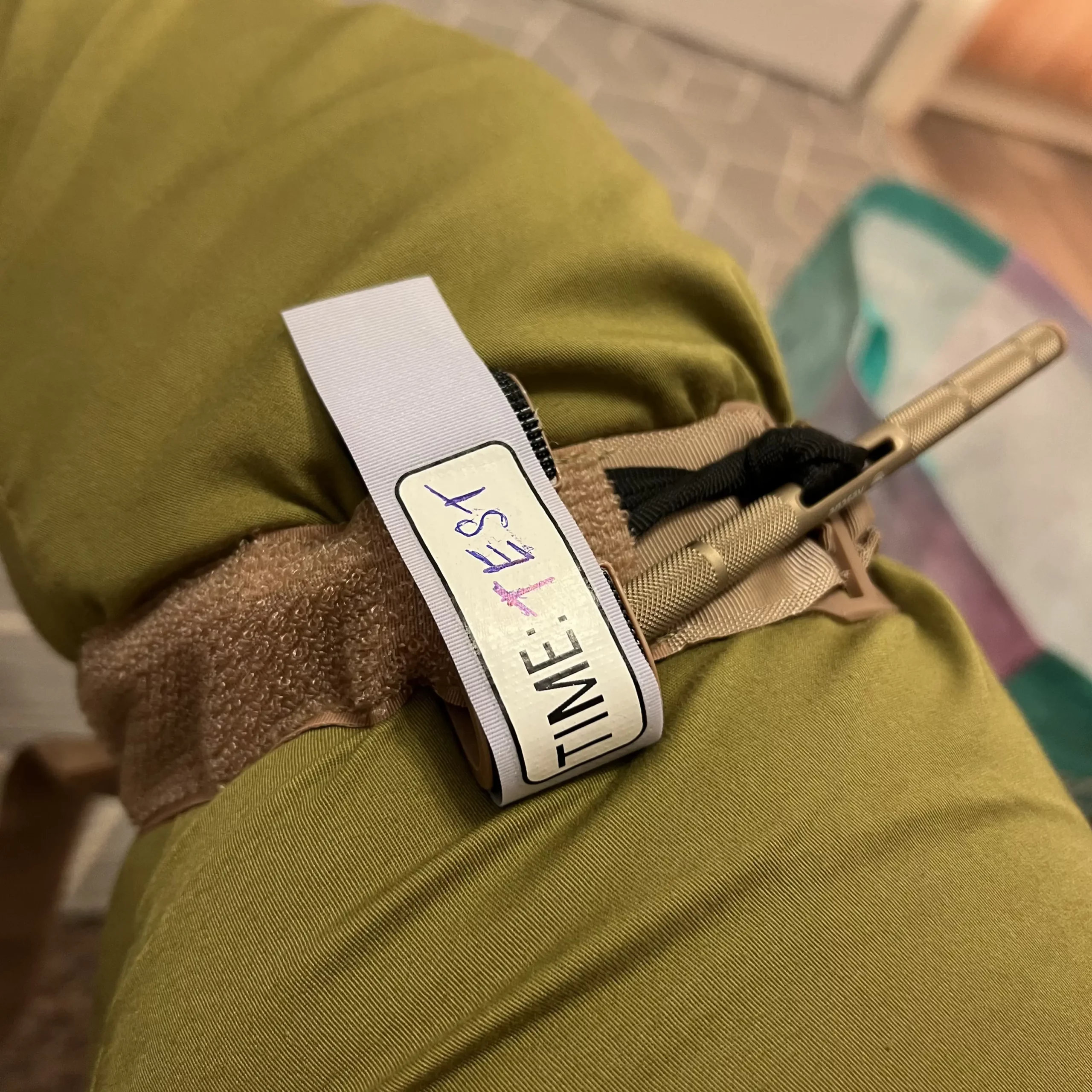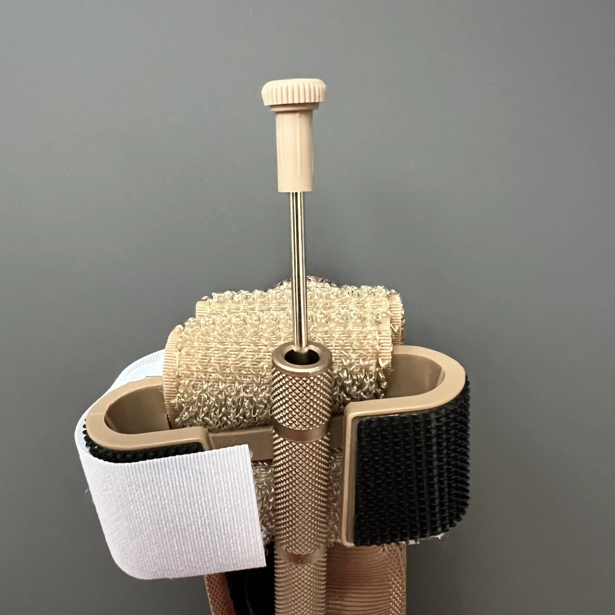 Použila pevný válec s měkkým molitanem a látkou na povrchu, který aspoň malinko simuluje šířku končetiny. Použila jsem 4 otočky vratidla po jeho maximálním dotažení. Nebylo zde patrné jediné poškození turniketu, potrhání švů nebo vnitřního pásku. Nastal ale problém u spony ve tvaru písmene „C“, do které se vratidlo zajišťuje. Vratidlo zde nebylo možné jednou rukou do spony zajistit. Oběma rukama to bylo obtížné. Plast spony „C“ je příliš měkký a jeho konce se tak stáčí dovnitř. To samé jsem vyzkoušela s CAT (jak patrno z fotky, CAT toto nedělá).