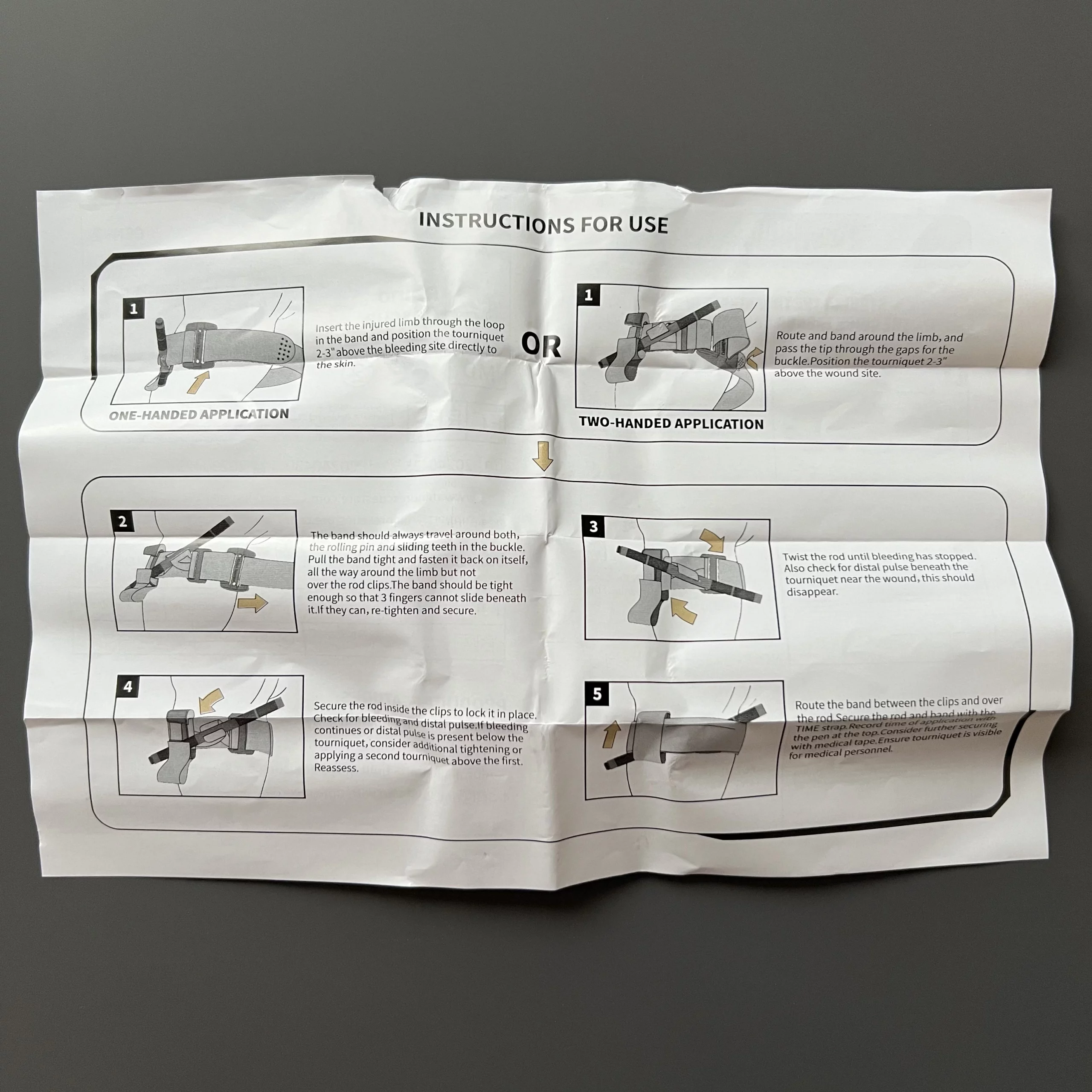 Turniket CAT má velmi jemný obal, který snadno roztrhnete i jednou rukou. Doporučení ale je, aby byl turniket již připraven na použití, proto je vhodnější jej před uloženým do batohu nebo na svou výstroj z obalu vyndat. Originální CAT je také poskládán tak, že není třeba s ním více manipulovat. Je složen tak dobře, že jej snadno použijete jednou rukou.