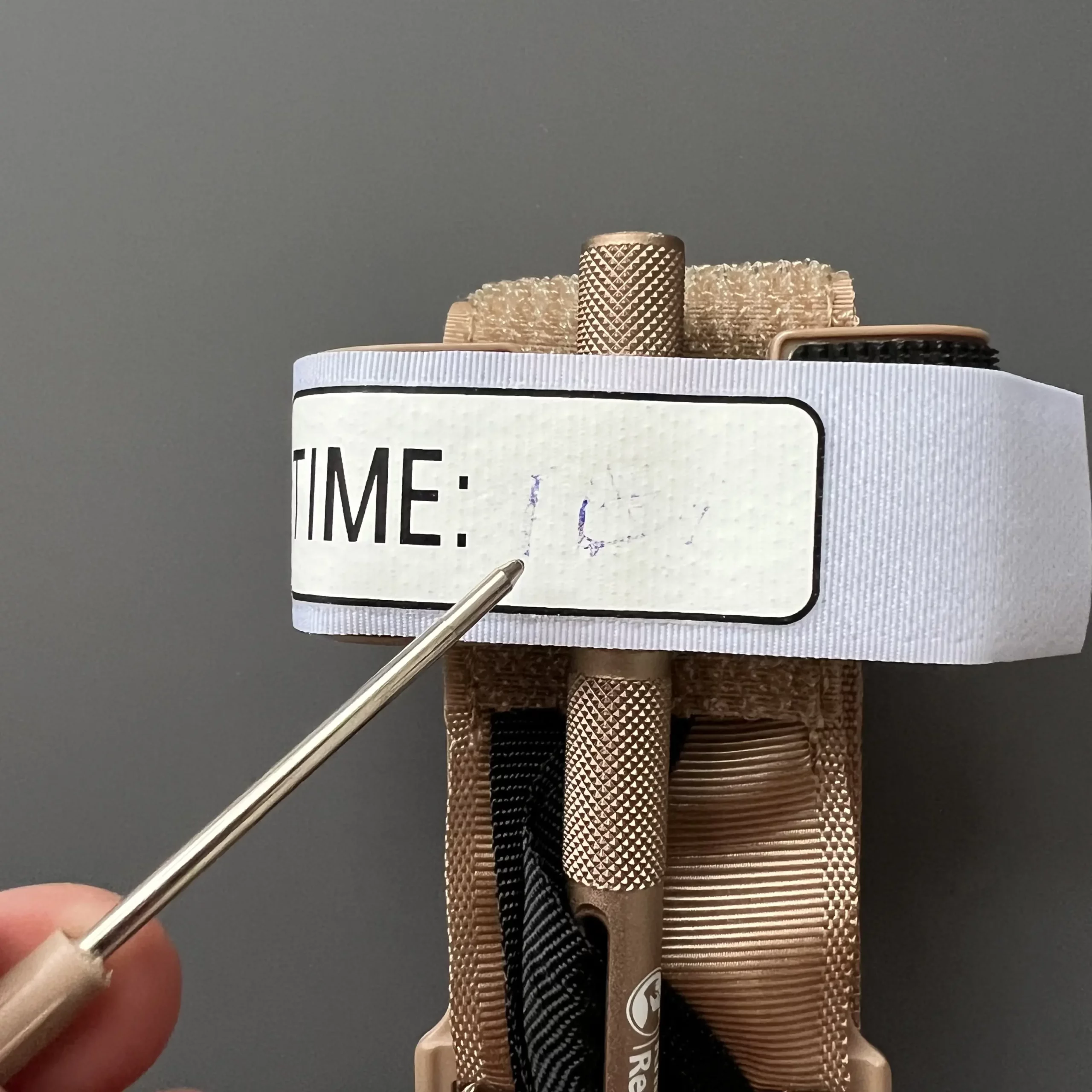 Turniket Rhino obsahuje malé kuličkové pero, které je určeno k popisu času naložení turniketu. Je uloženo v jednom konci vratidla (podobně jako je třeba uloženo párátko a pinzeta u nožů Victorinox). Bohužel, toto pero ale na první dobrou nepíše. Je potřeba ho nejprve rozepsat na obyčejném papíru a následně začít psát na proužek „TIME“ na turniketu od Rhino Rescue (fixa udělá lepší službu).